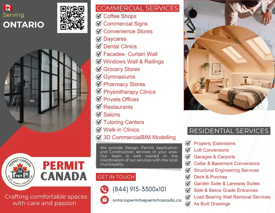 Permit Canada offers specialized design and permit application services for loft conversions in the province of Ontario. We help building contractors transform underutilized attic spaces into functional, code-compliant living areas with precision and efficiency. Our detailed plans and streamlined approval process ensure your loft conversion projects progress smoothly from concept to completion.